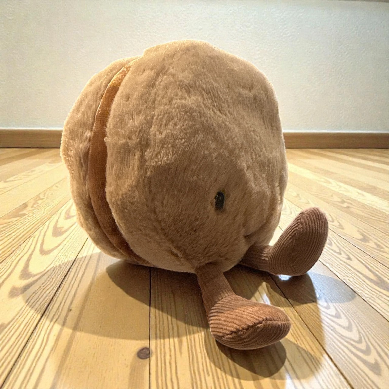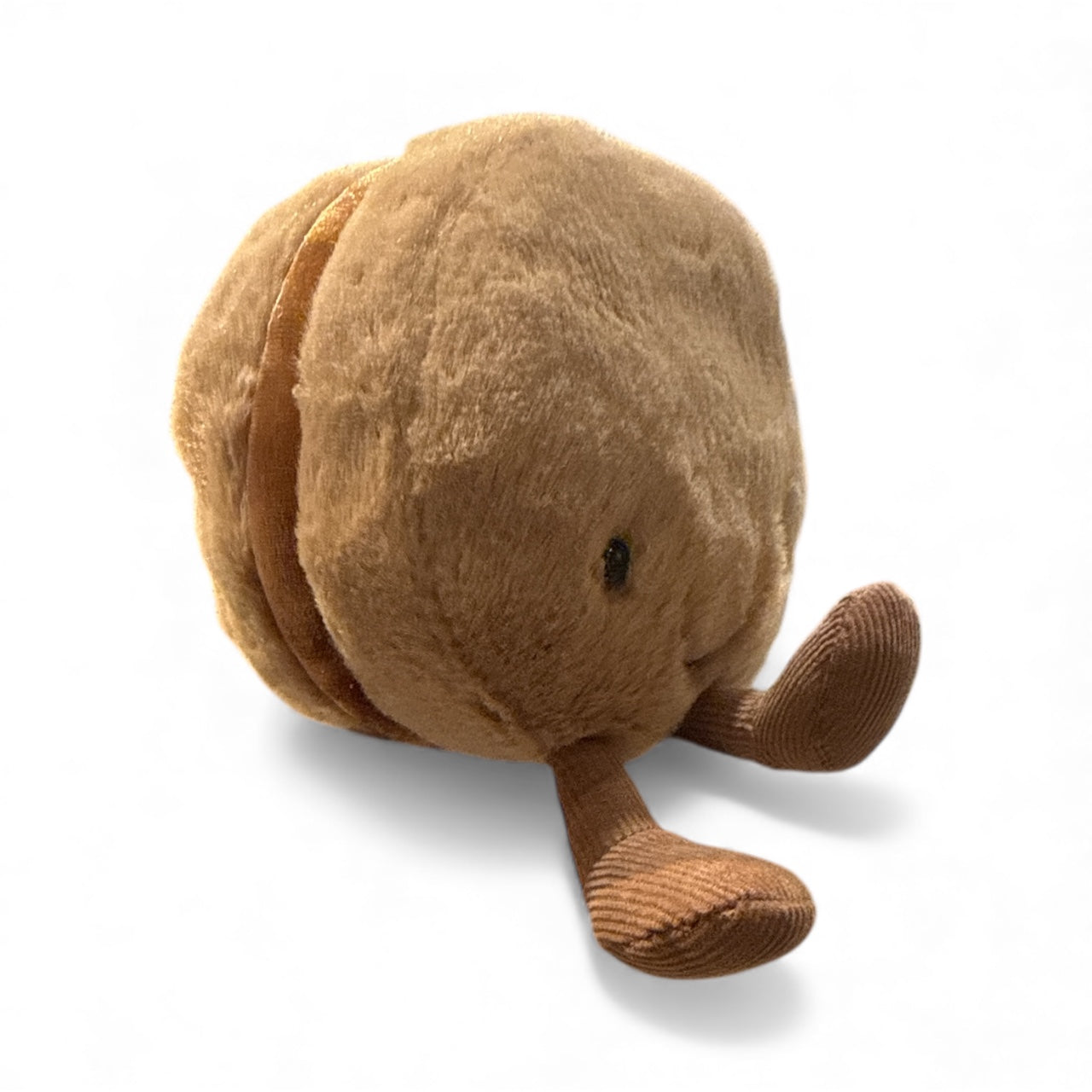 Mona Macaron von Amuseables begeistert mit ihrem schokoladenfarbenen, superweichen Fell. Ihre kakaobraunen Cordfüße und die samtige Füllung machen sie besonders kuschelig, während das dezente, gestickte Logo auf der Rückseite einen eleganten Akzent setzt.