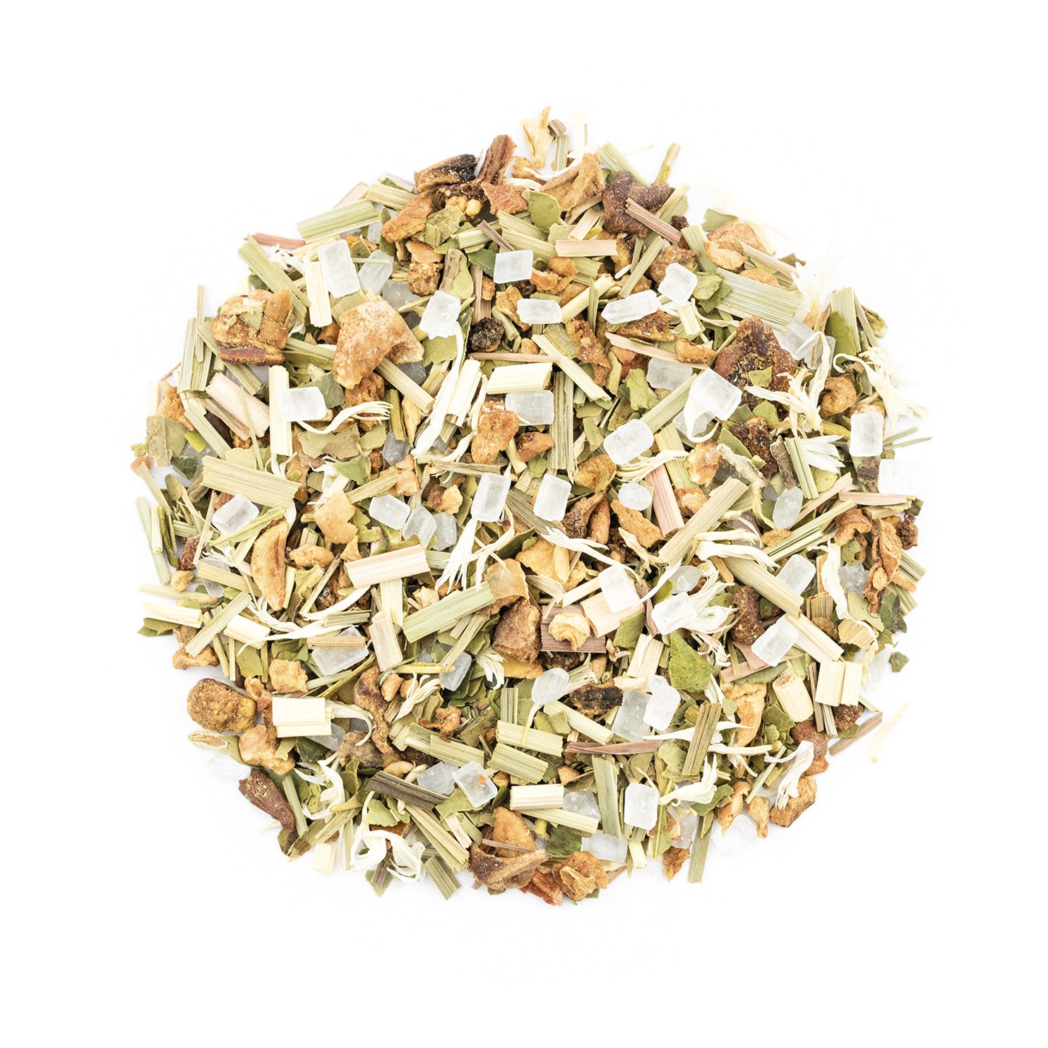 Geröstete Birnenstücke (22%), Apfelstücke, Kluntinchen, Mate grün, Zitronengras, Aroma, Kornblumenblüten.
