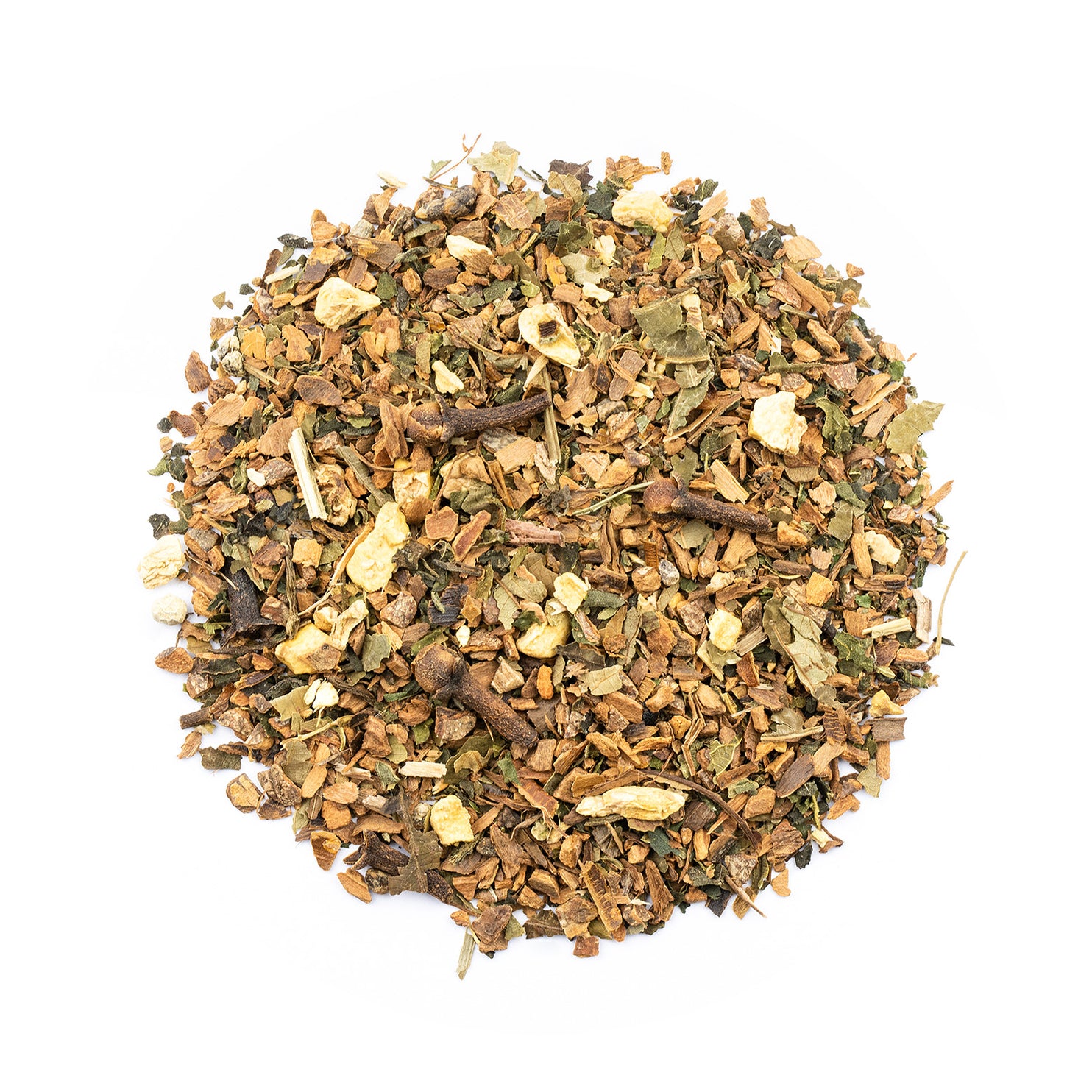 Zimt, Ingwer, Brennnesselblätter, Nelken, süße Brombeerblätter, Kardamomsaat, weißer Pfeffer.
