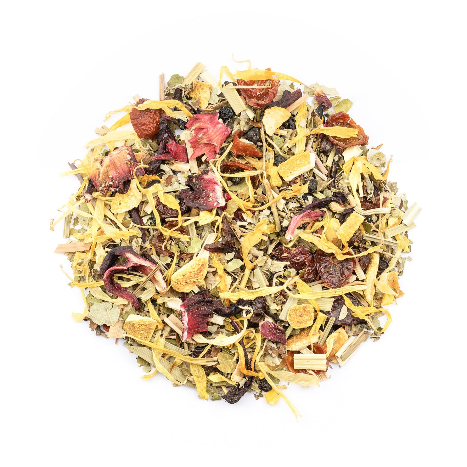 Hagebutten, Brombeerblätter, Holunderbeeren, Orangenschalen, Hibiskus, Zitronengras, süße Brombeerblätter, Ringelblumen, Aroma.