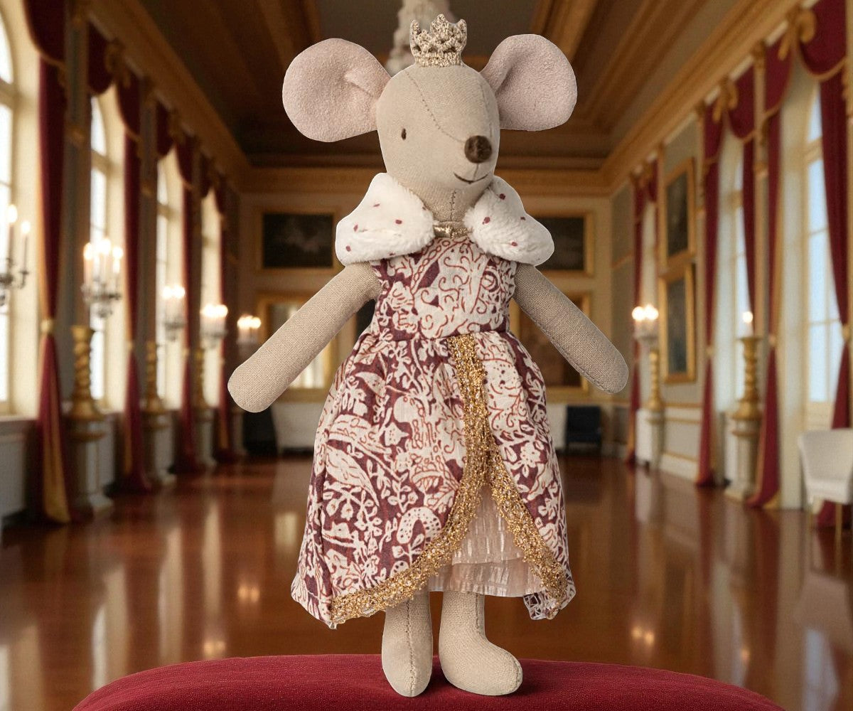 Die Königinnenmaus in Mama-Größe ist bereit, in ihrem Schloss als Gastgeberin zu glänzen. Sie trägt ein prachtvolles königliches Kleid und eine funkelnde Krone und fügt sich perfekt in den Schlosssaal ein.