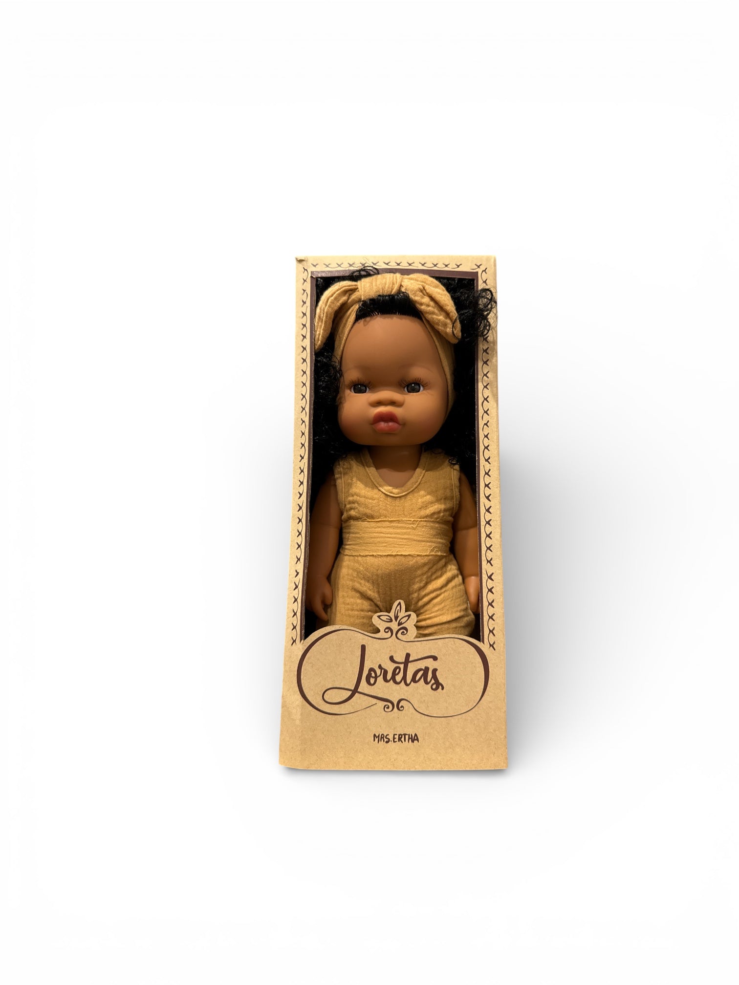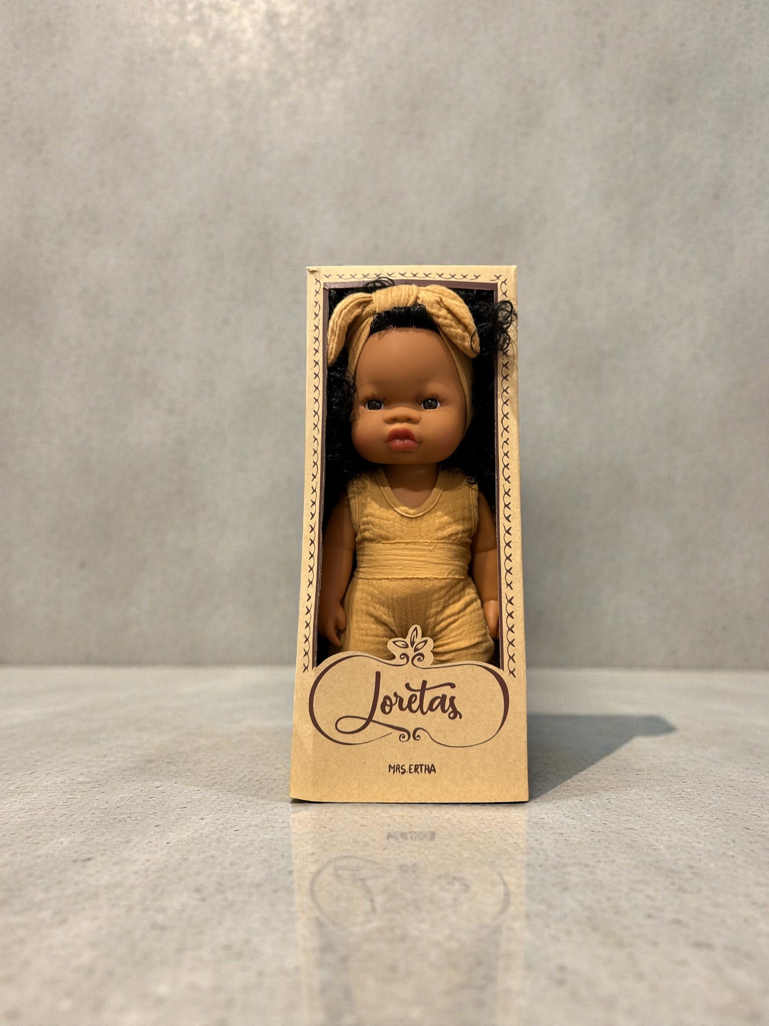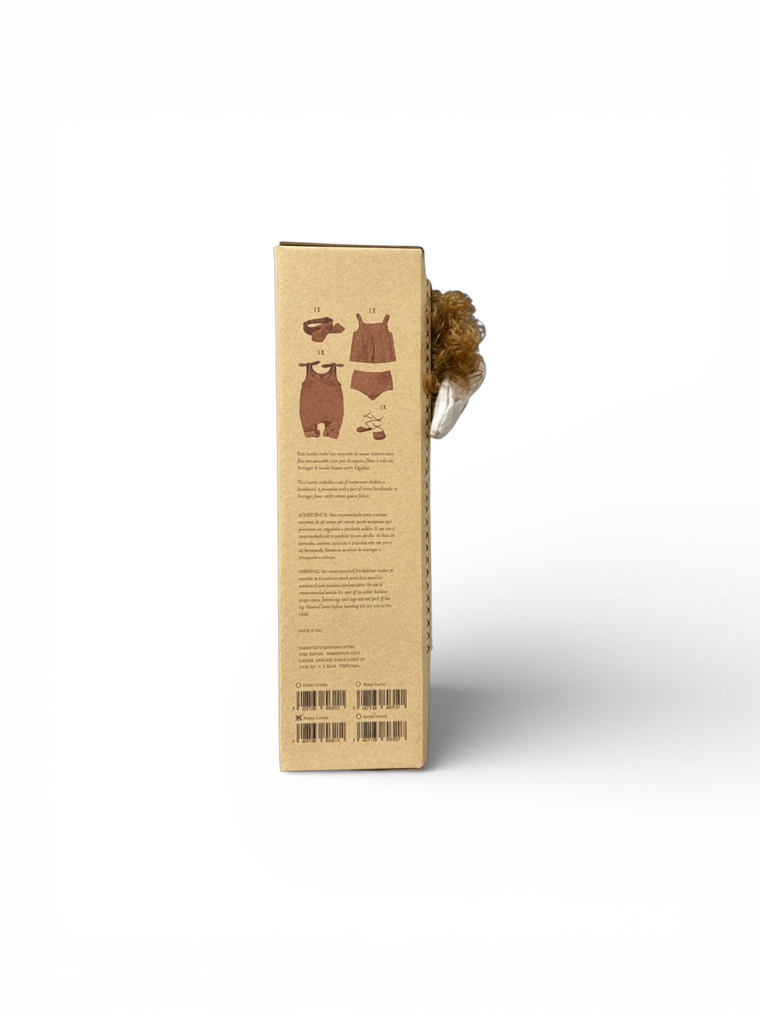 Das Set umfasst Unterwäsche, ein Haarband, einen Jumpsuit und ein Paar Schuhe. Alle Teile werden in Portugal aus 100 % Baumwollgaze handgefertigt. Die stabile Verpackung aus Recyclingkarton rundet das hochwertige und nachhaltige Gesamtbild ab.