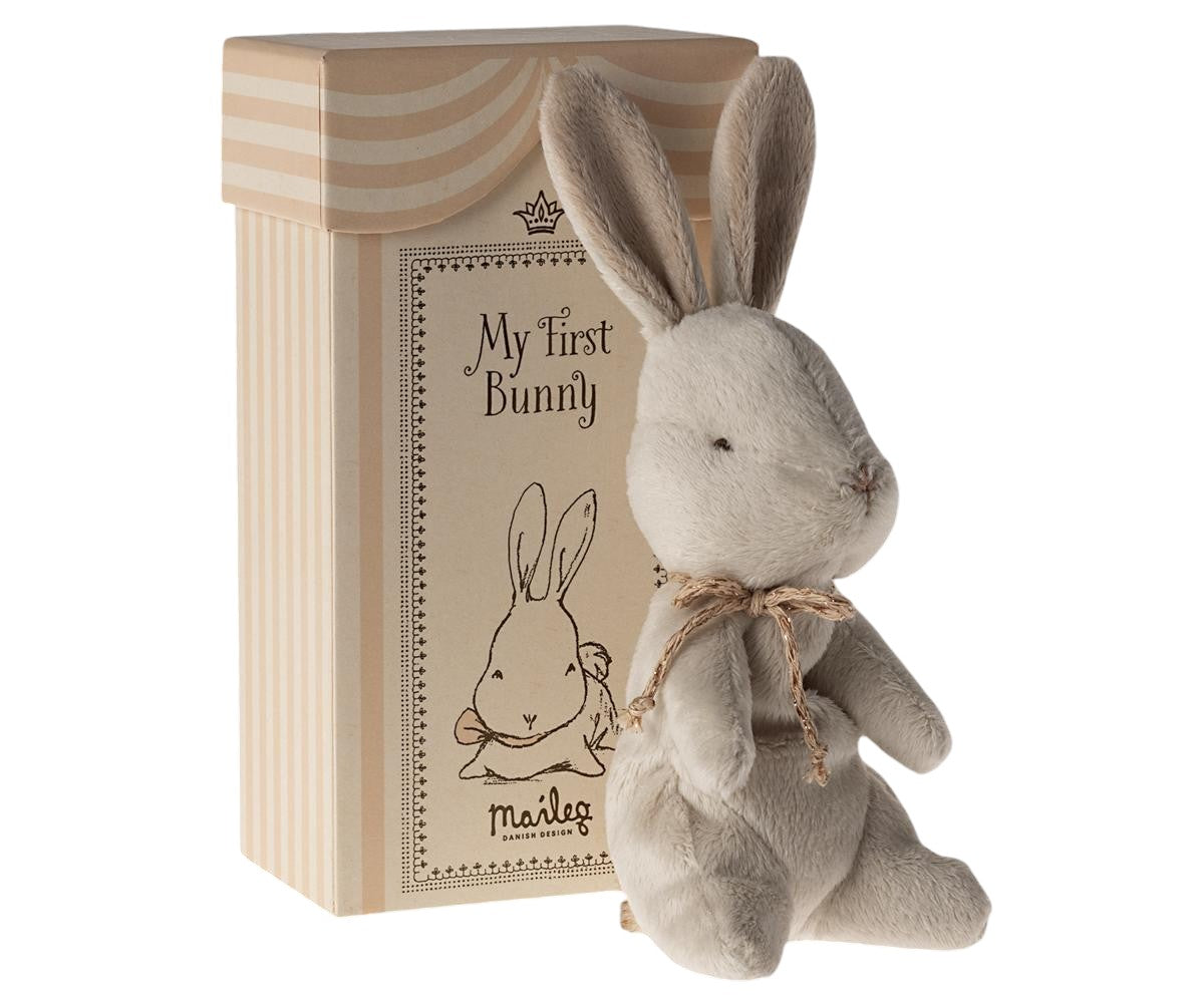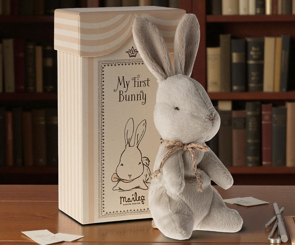 Mein erster Hase – perfekt für kleine Hände. Gefertigt aus kuschelweichem Plüsch und mit einem farbigen Halsband verziert. Der Hase kommt in einer hübschen Geschenkbox, in die persönliche Geburtsinformationen eingetragen werden können – ein ideales Geschenk zur Geburt.