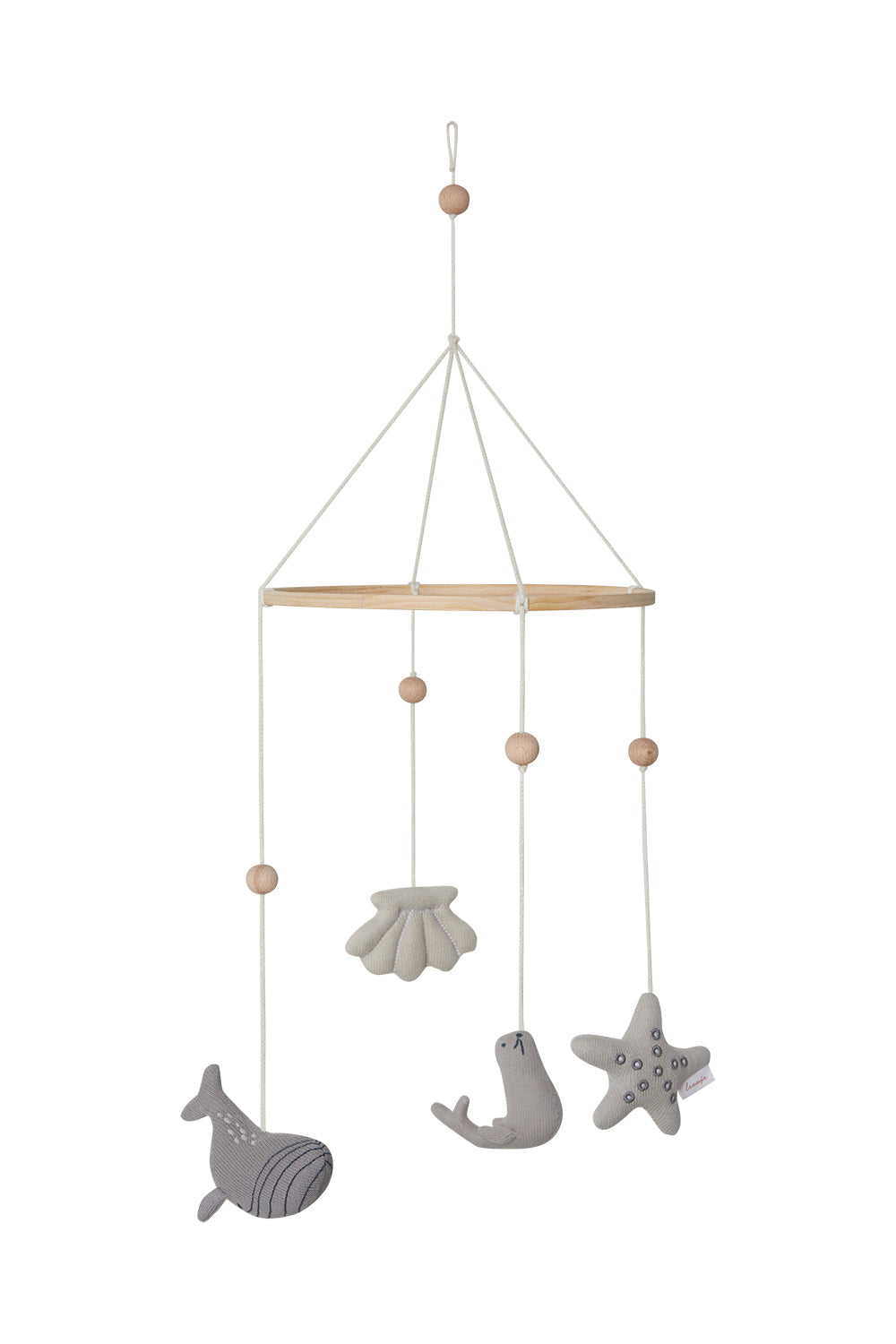 Mobile mit gestrickten Figuren: Wal, Seestern, Muschel, Robbe