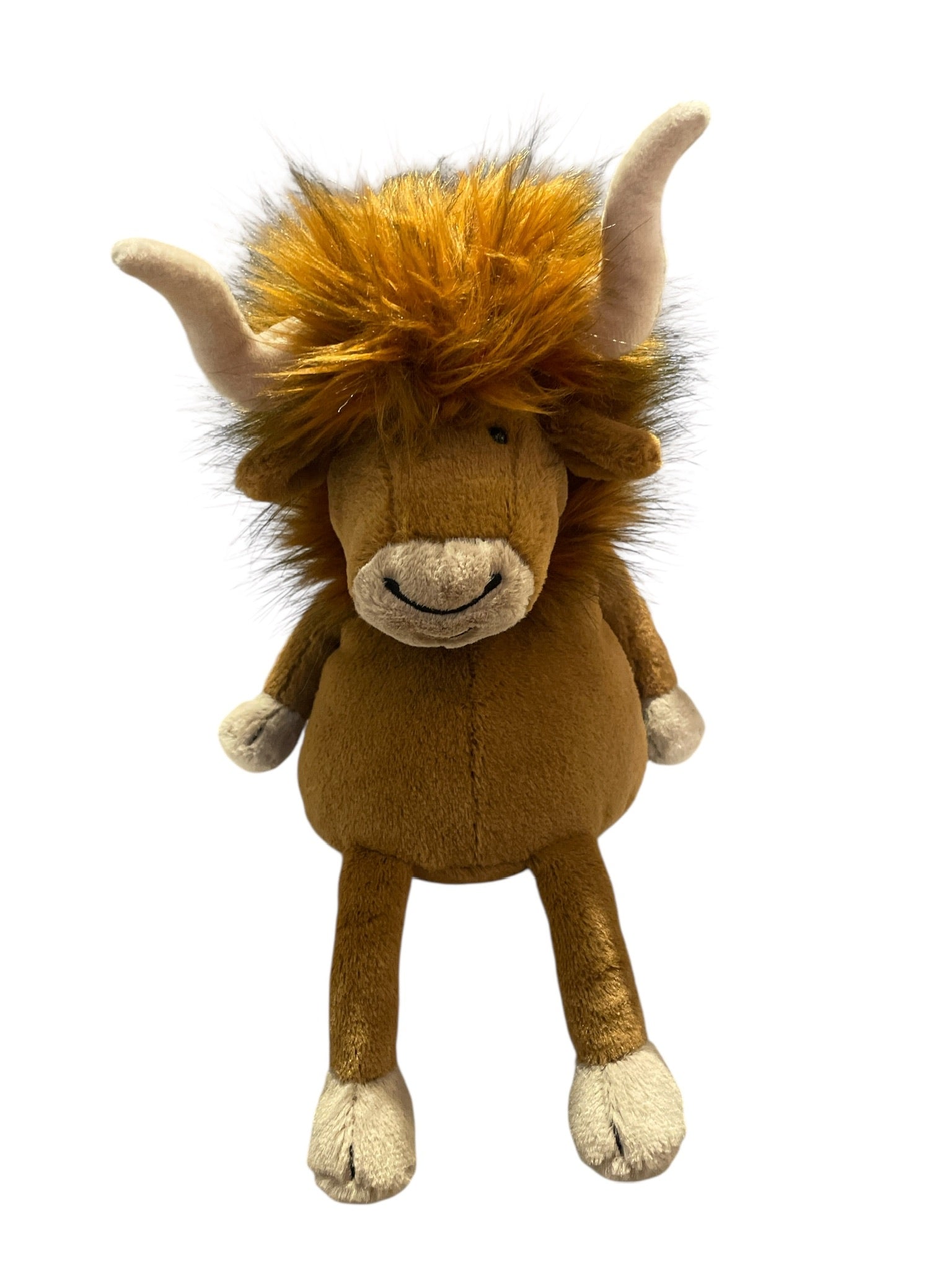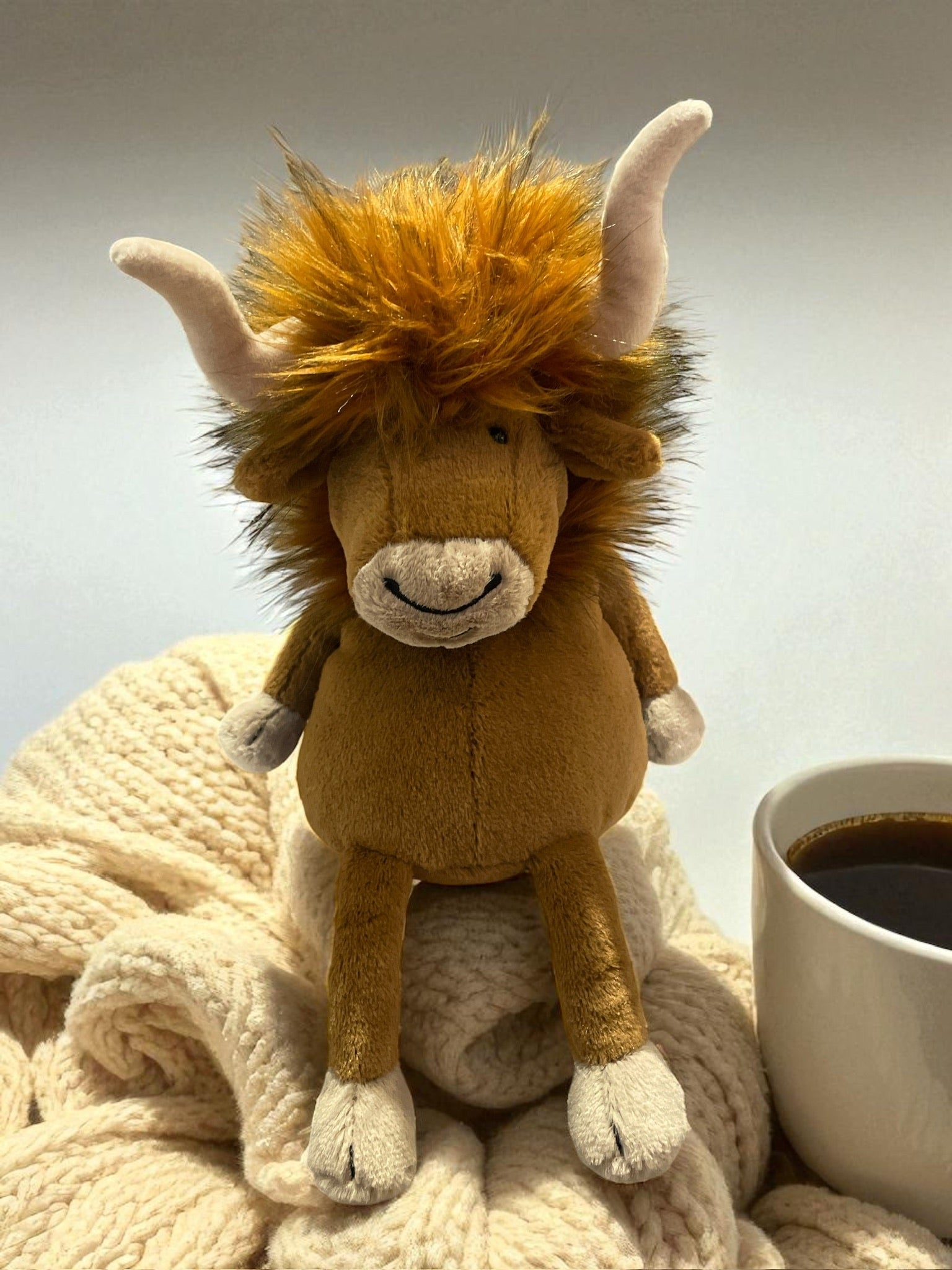 Ramone Bull beeindruckt mit seidiger Mähne in Orange und Anthrazit, beigen Kunstwildlederhörnern, zimtfarbenem Bauch und buschigem Schwanz. Die große aufgenähte Nase in Nougatbraun und gespaltene Hufe machen ihn zum perfekten Kuschel- und Sammelfreund für Tierliebhaber jeden Alters.
