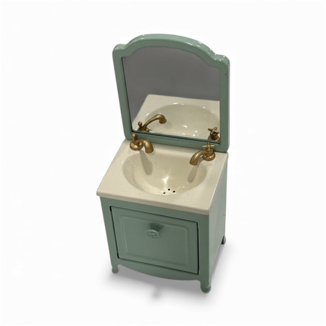 Ein unverzichtbares Möbelstück für das Badezimmer in jedem Mäusehaus: das Waschbecken mit praktischem Unterschrank und Spiegel. Ergänze das Spiel mit der Maileg-Toilette und der Badewanne, um das Badezimmer perfekt auszustatten.