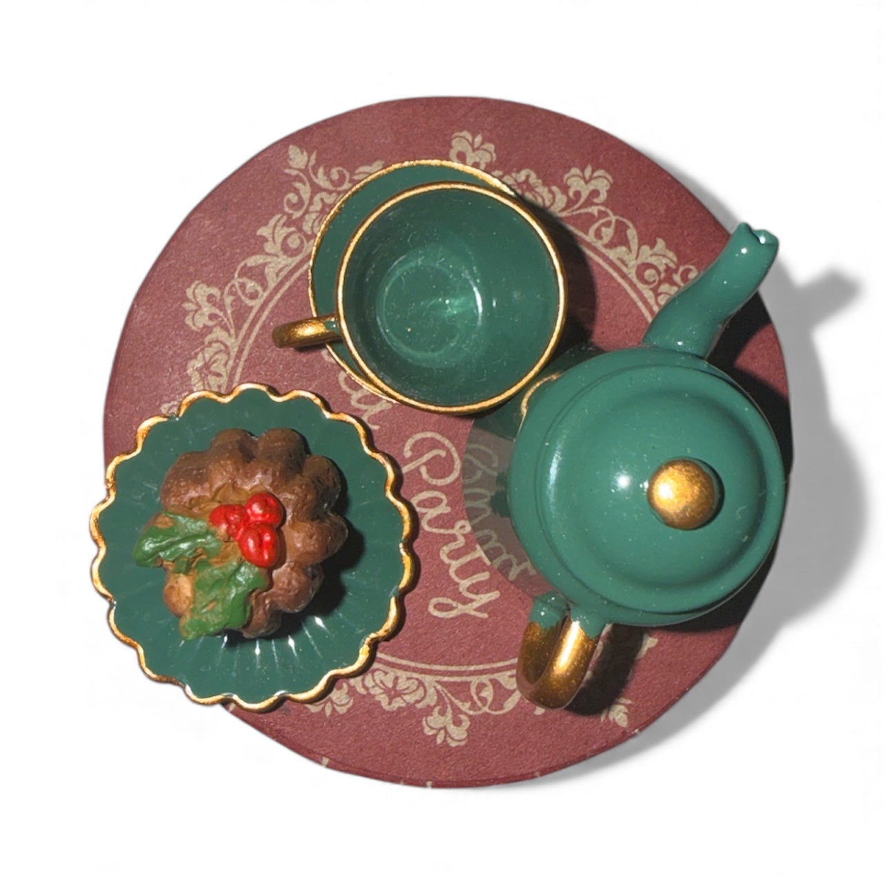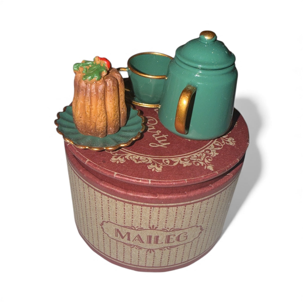 Gestalte einen festlichen Weihnachtsteetisch für die Mäusefamilie mit diesem liebevollen Set. In der Geschenkbox findest Du eine metallene Teekanne, zwei Tassen, einen Teller und einen kunstvoll dekorierten Kuchen aus Polyresin – perfekt für gemütliche Teestunden im Miniaturformat.