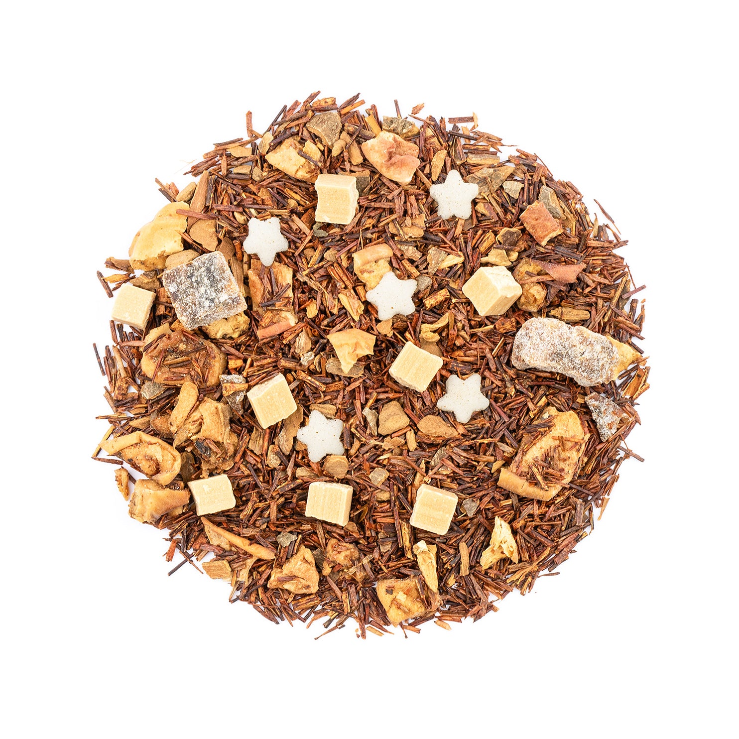 Rooibos (geschützte Ursprungsbezeichnung), Apfelstücke, Dattelwürfel (Datteln, Reismehl), Zimt (10%), Karamellwürfel (gezuckerte MAGERKONDENSMILCH, Zucker, Glukosesirup, BUTTERFETT, Feuchthaltemittel: Sorbitsirup, Emulgator: Mono- und Diglyceride von Speisefettsäuren), Zucker-Sterne (Zucker, Reismehl, Reisöl, Kartoffelstärke, Aroma), Aroma.