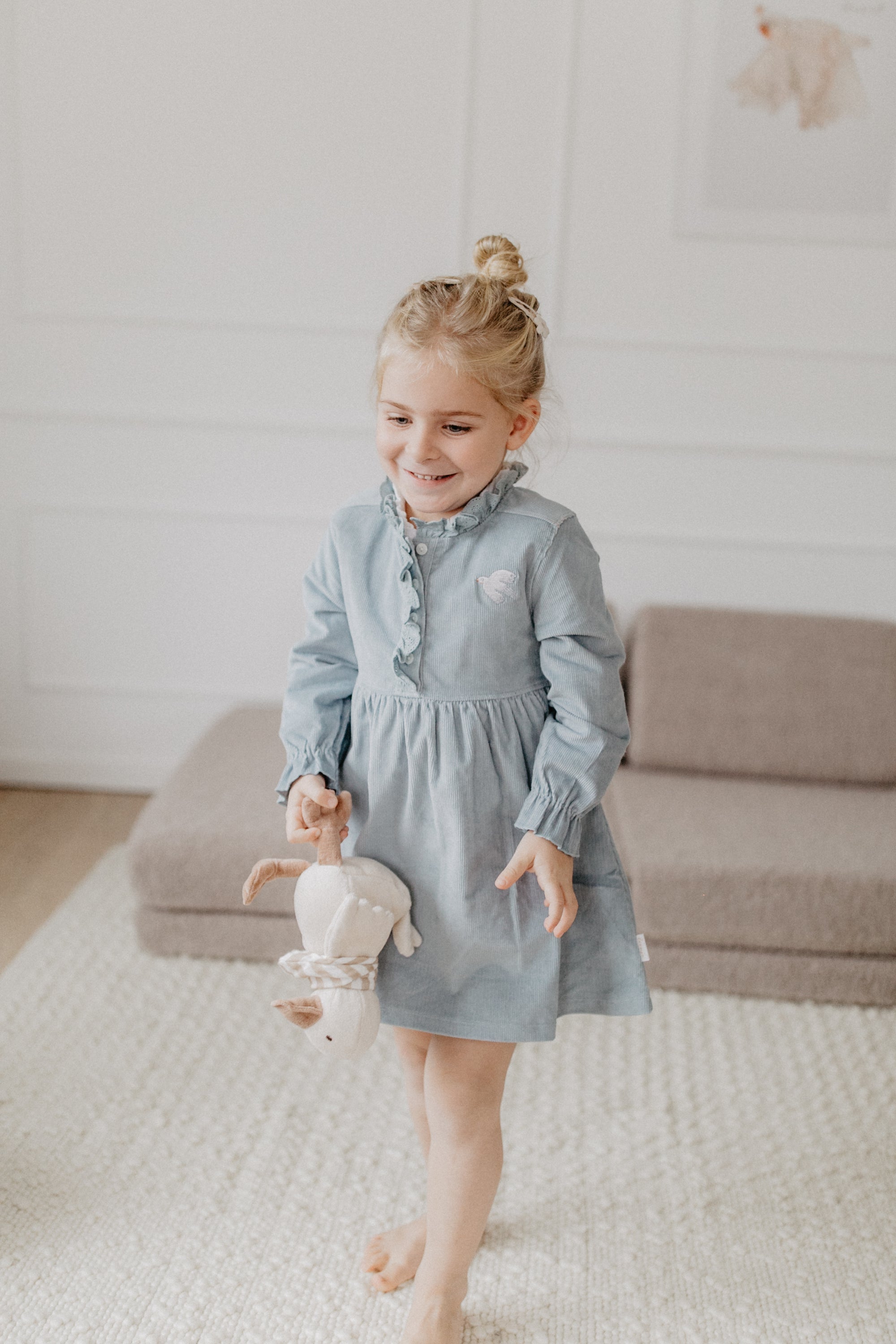 Kleid aus Kord mit kleinen Rüschen und Stickerei ( Taube) vorn